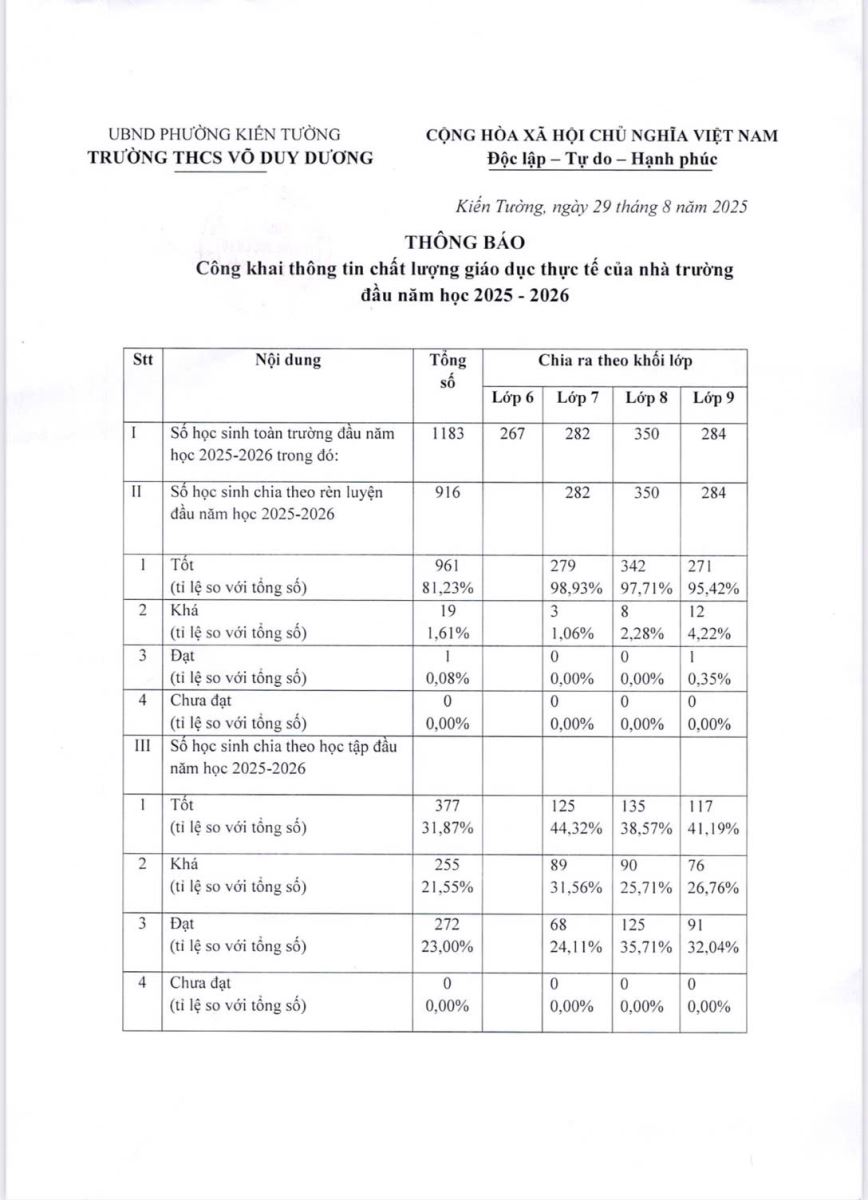 THÔNG BÁO CÔNG KHAI CHẤT LƯỢNG GIÁO DỤC THỰC TẾ CỦA NHÀ TRƯỜNG ĐẦU NĂM HỌC 2025 - 2026